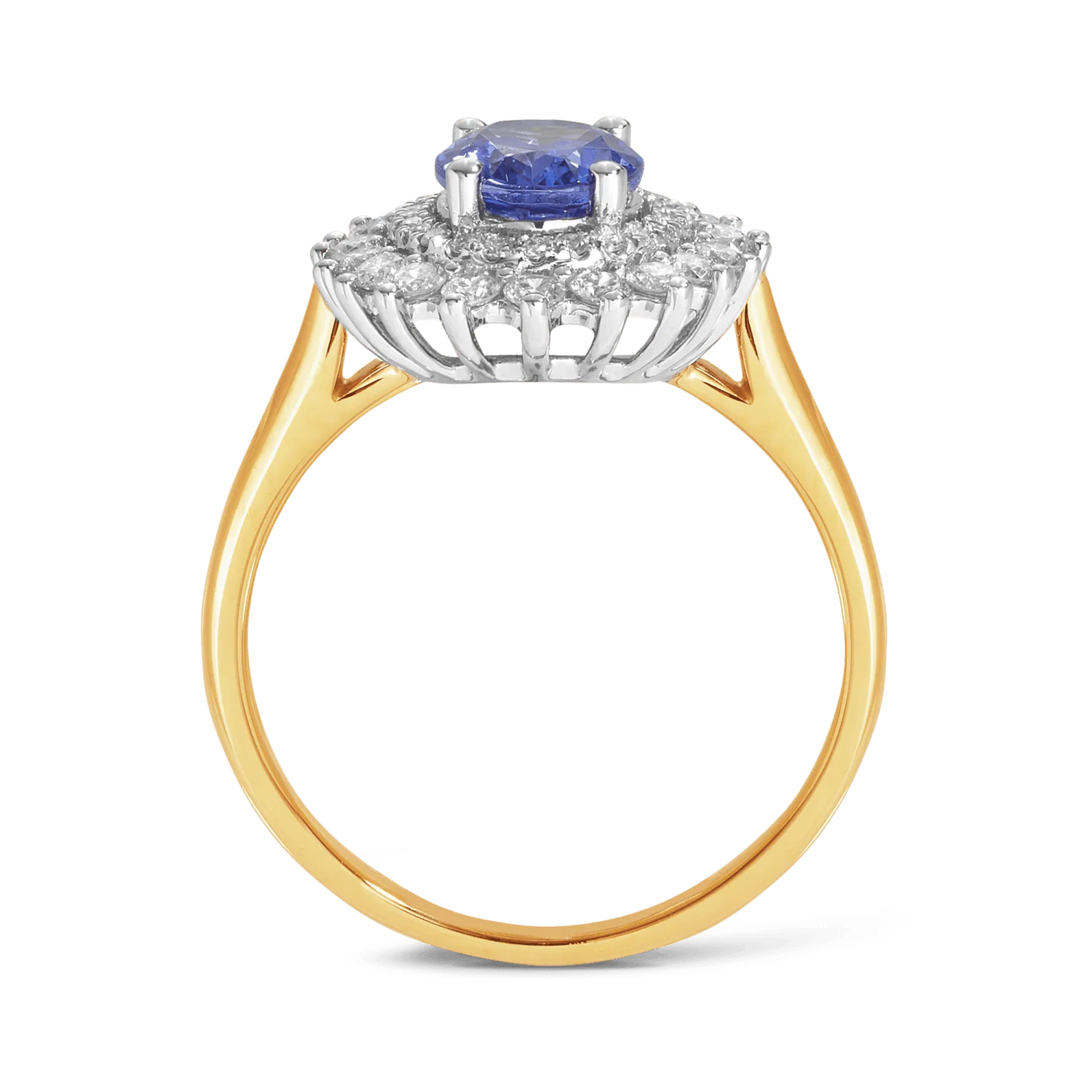 Dazzle in elegance with this Tanzanite & 0.50ct Diamond Double Halo Ring, featuring an 8 x 6mm oval tanzanite from Tanzania surrounded by sparkling natural round diamonds in a glamorous double halo. The centre and halo are set in 9ct white gold, while the polished 9ct yellow gold band creates a striking two-tone design, perfect for special occasions or as a statement ring.